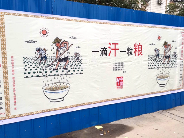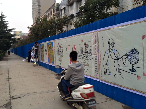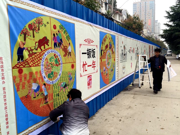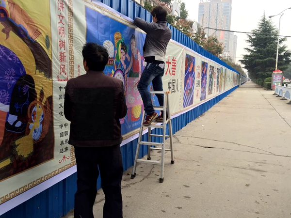 為了配合全國文明城市創(chuàng)建,今年雪松路,中華路,驛城大道升級改造工程路段的施工圍擋墻上張貼公益廣告。主要內(nèi)容是講文明樹新風、社會主義核心價值觀。圖為工作人員張貼廣告布。(本臺記者 張洋 文/圖)
