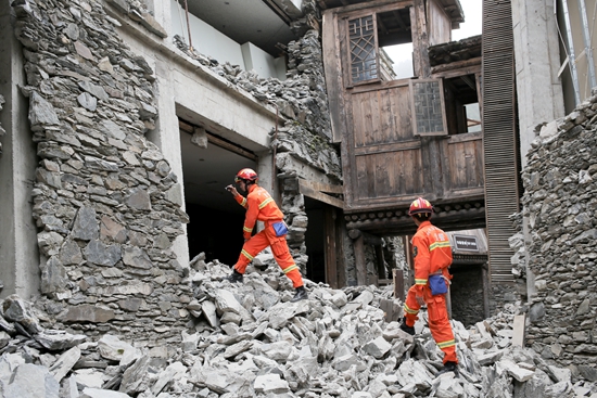 8月9日下午,武警四川應急救援部隊官兵正在九寨天堂洲際大飯店拉網(wǎng)式搜尋幸存者。汪龍華/攝
