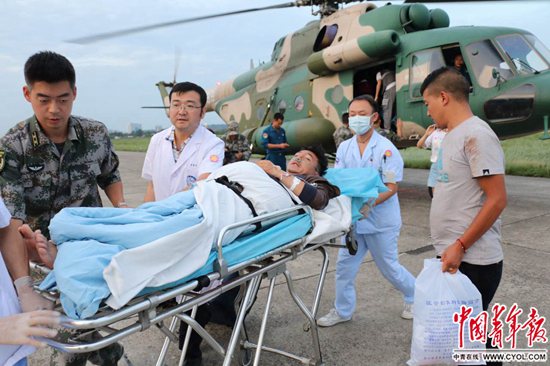 ????8月9日傍晚,通過77集團軍某陸航旅救援直升機從九寨溝震區(qū)轉運出來的首批傷員抵達成都,來自四川大學華西醫(yī)院、四川省人民醫(yī)院的急救人員從飛機上接下重傷員。中國青年報·中青在線記者王鑫昕/攝