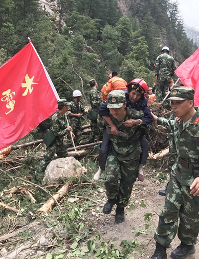 8月9日,武警水電救援人員在九寨溝地震災區(qū)轉移受災群眾。葛強俊/攝(發(fā))