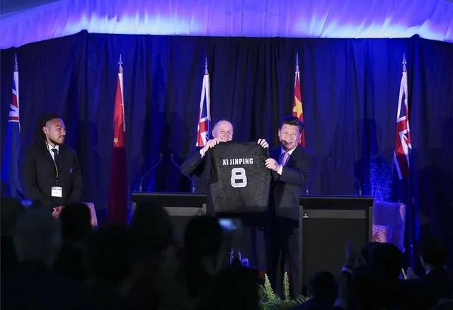 2014年11月20日,新西蘭首都惠靈頓,中國國家主席習(xí)近平與時任新西蘭總理約翰·基共同會見記者。記者會結(jié)束之際,英式橄欖球球星、全黑隊球員瑪阿·諾努走上臺,向習(xí)近平贈送了該隊的標志性黑色球衣,號碼是中國老百姓喜聞樂見的數(shù)字“8”。