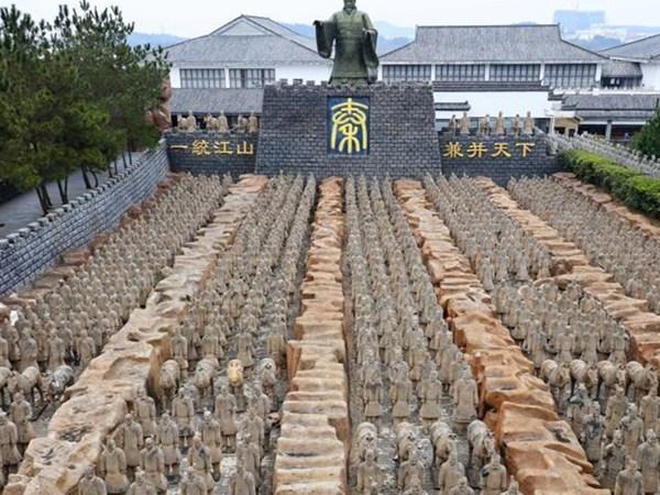 記者在景區(qū)介紹上看到,整個(gè)秦始皇塑像群占地800至1000平方米,由秦始皇雕像和兵馬群像組成,展現(xiàn)的是秦始皇一統(tǒng)江山、兼并天下盛大場面。景點(diǎn)中的秦始皇雕像站在城墻上揮手,兩側(cè)的城墻上刻有“一統(tǒng)江山”和“兼并天下”字樣,城墻下整齊地排列著兵馬群像。