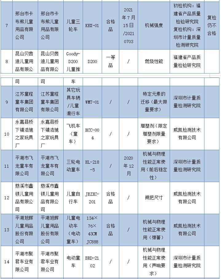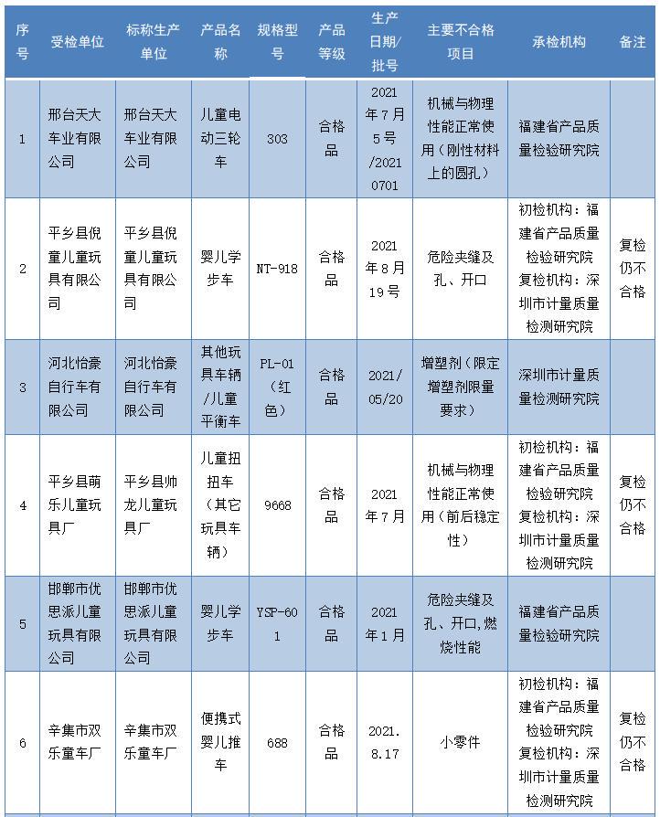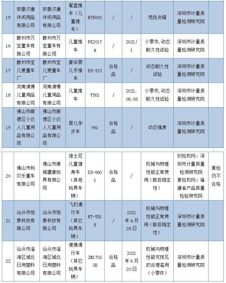 不合格項(xiàng)目涉及閘把尺寸,機(jī)械強(qiáng)度,小零件,動(dòng)態(tài)耐久性試驗(yàn),危險(xiǎn)夾縫及孔、開(kāi)口,動(dòng)態(tài)強(qiáng)度,前后穩(wěn)定性,剛性材料上的圓孔,彈簧,聲響要求等10個(gè)機(jī)械與物理性能項(xiàng)目,以及燃燒性能、特定元素的遷移、增塑劑。