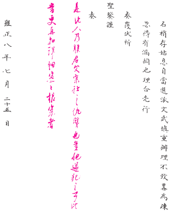四月,雍正向親近大臣下密旨,命其訪求道士。鄂爾泰于五月二十日收到密諭。原文是朱諭:“可留心訪問,有內(nèi)外科好醫(yī)生,與深達(dá)修養(yǎng)性命之人,或道士或講道之儒士、俗家,倘遇緣訪得時(shí),必委曲開導(dǎo),令其樂從方好,不可迫之以勢(shì),厚贈(zèng)以安其家,一面奏聞,一面著人優(yōu)待送至京城,朕有用處,竭力帶朕訪求之,不必預(yù)存疑難之懷,便薦送非人,朕也不怪也。朕自有試用之道。不可視為具文從事。慎密為之。其他省也開單。”鄂爾泰稱自己自幼身體羸弱,二十多年也沒有遇到“異人”。