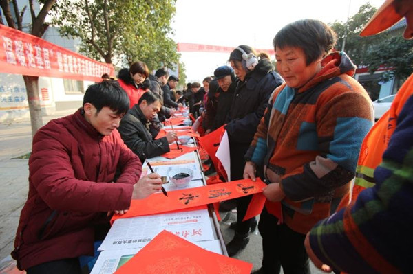 活動(dòng)現(xiàn)場(chǎng),開發(fā)區(qū)萬(wàn)木森林幼兒園的志愿者們?yōu)榻n立卡的2戶貧困孩子和8戶留守兒童捐贈(zèng)了書包、文具等價(jià)值2000元的大禮包。另一邊,駐馬店市青年書法家協(xié)會(huì)的書法家們揮毫潑墨,各顯身手,一幅幅蒼勁有力、喜慶吉祥的春聯(lián)印入眼簾。經(jīng)過(guò)三個(gè)小時(shí)的潑墨創(chuàng)作,現(xiàn)場(chǎng)共送出春聯(lián)500多幅,每一幅火紅的春聯(lián)都傳遞著吉祥與喜氣。
