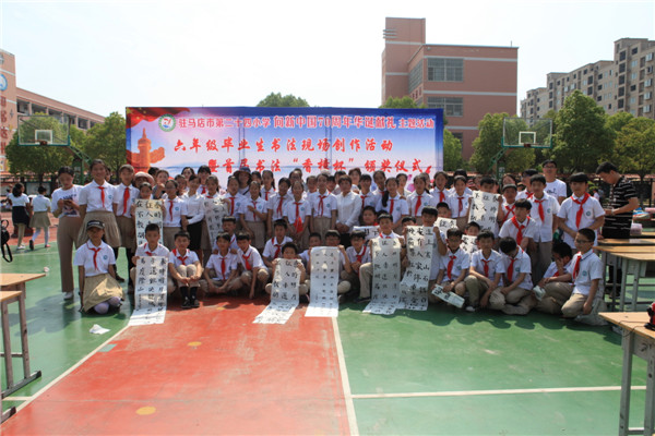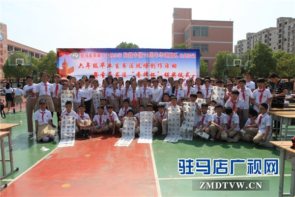 駐馬店廣電融媒體訊:(記者 王立坤)行楷隸篆見功夫,書法藝術(shù)耀碧空。5月31日上午,在“六一”國(guó)際兒童節(jié)來(lái)臨之際,駐馬店市第二十四小學(xué)舉辦了“向新中國(guó)七十周年華誕獻(xiàn)禮”六年級(jí)畢業(yè)生書法現(xiàn)場(chǎng)創(chuàng)作暨首屆書法“香樟杯”頒獎(jiǎng)活動(dòng)。本活動(dòng)由賈麗副校長(zhǎng)主持,六年級(jí)全體畢業(yè)生及部分家長(zhǎng)朋友們參加活動(dòng)。