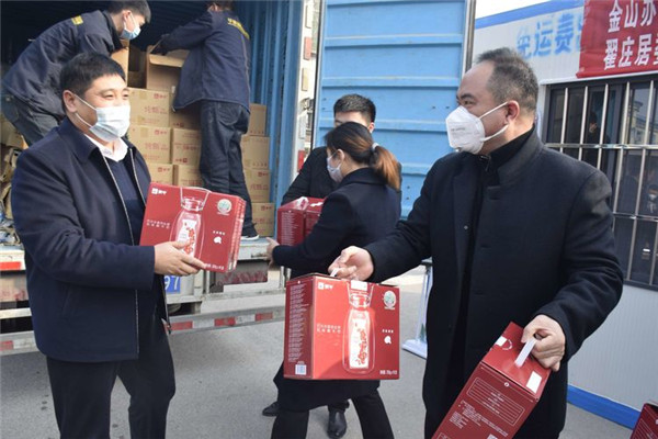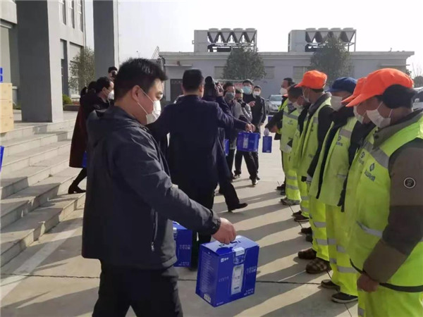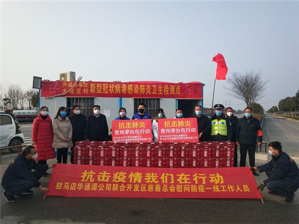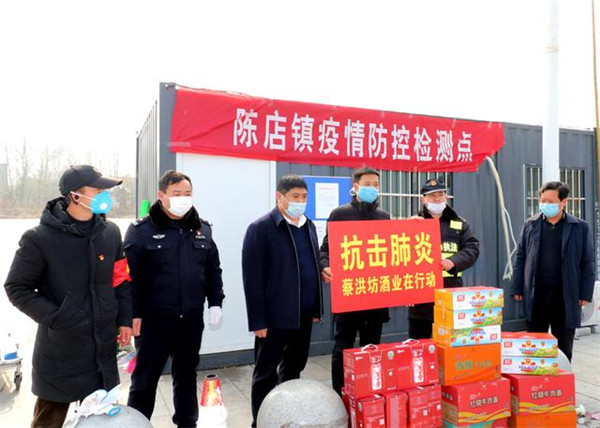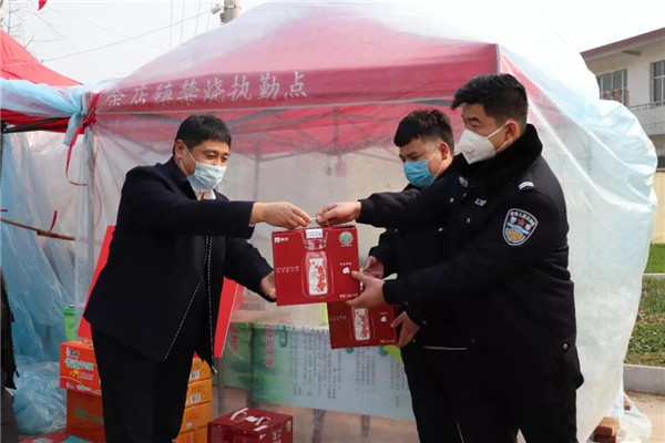 2月3日下午,華源酒業(yè)相關(guān)負(fù)責(zé)人將方便面、火腿腸、礦泉水等慰問品送到新蔡縣古呂鎮(zhèn)抗擊新型冠狀病毒感染肺炎疫情的一線執(zhí)勤人員手中。