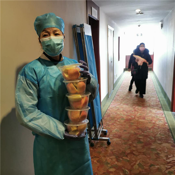 為保障隔離人員和一線醫(yī)護(hù)人員的飲食,隔離點(diǎn)安排專人做飯,提供餐點(diǎn);隔離人員的三餐、各種生活用品由醫(yī)護(hù)人員送到每個(gè)房間門口。“隔離不‘隔心’,隔離的是“病毒”,隔離不了的是“感情”。隔離人員在這里長時(shí)間不能和家人團(tuán)結(jié),忍受著我們難以想象的的煎熬,我們以最大程度幫助他們疏導(dǎo)情緒。”代華林介紹,為使入住者住的舒心、隔離的安心,實(shí)行24小時(shí)守護(hù)服務(wù),由專人負(fù)責(zé)按時(shí)配送品種豐富的營養(yǎng)餐和精品水果,設(shè)立專門的樓層管理人員隨時(shí)同入住者保持聯(lián)系,滿足生活需求。通過貼心服務(wù),打消隔離人員的顧慮,贏得他們的滿意。