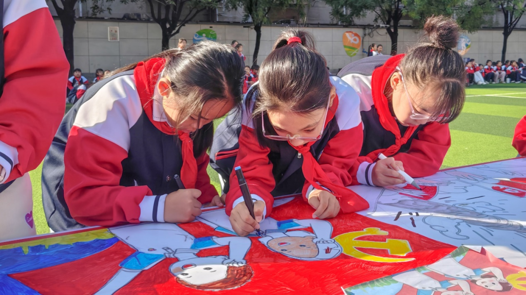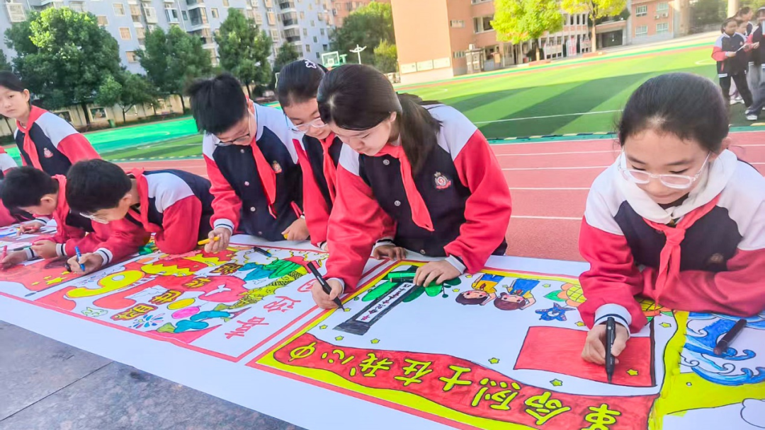 老師們也積極投身其中,成為孩子們創(chuàng)作路上的同行者:有的悉心指導(dǎo)繪畫技巧,有的耐心協(xié)助調(diào)色,還有的用相機定格下這一個個難忘的瞬間。在師生的齊心協(xié)力下,這幅意義非凡的百米長卷終于完成,孩子們望著共同創(chuàng)作的作品,臉上洋溢著掩飾不住的自豪與喜悅。
