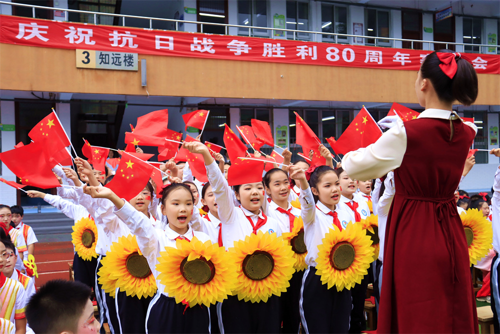 演唱過程里,同學們始終精神飽滿、激情滿懷。有的班級歌聲悠揚婉轉(zhuǎn),如潺潺流水般滋潤著在場每個人的心田;有的班級歌聲鏗鏘有力,盡顯新時代少年的朝氣與擔當。操場上,同學們以整齊的方陣列隊,搭配劃一的動作與投入的神情,每一場表演都贏得現(xiàn)場觀眾的陣陣喝彩。