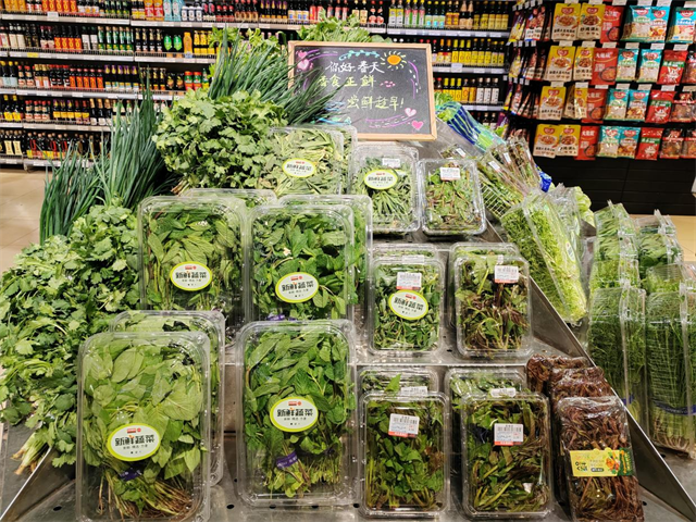 走進(jìn)歡樂愛家超市迪士尼店,便能看到香椿、面條菜、芹菜、紅莧菜、春筍等鮮嫩水靈的時蔬春菜碼放整齊,十分惹眼,吸引了不少市民前來選購。