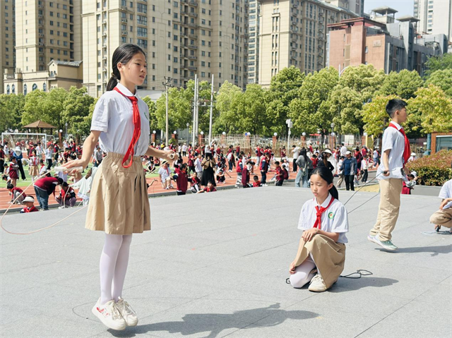 走進(jìn)金雀路小學(xué)大課間的操場(chǎng),你會(huì)瞬間被花樣跳繩活動(dòng)的場(chǎng)景所吸引,孩子們輕快地舞動(dòng)著手中的跳繩,動(dòng)作輕盈而嫻熟,機(jī)智地跳躍、跑動(dòng),笑意寫在臉上、快樂(lè)洋溢心中,跳繩活動(dòng)儼然成為學(xué)校的一道風(fēng)景。