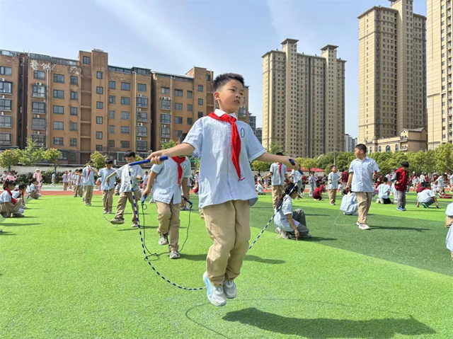 為落實(shí)立德樹(shù)人的根本任務(wù),實(shí)施“五育并舉”,全面落實(shí)“雙減”政策,促進(jìn)學(xué)生身心健康發(fā)展,駐馬店經(jīng)濟(jì)開(kāi)發(fā)區(qū)金雀路小學(xué)積極探索獨(dú)具特色的課間活動(dòng)形式,在大課間活動(dòng)中融入花樣跳繩項(xiàng)目,已成為課間一道靚麗的風(fēng)景線。